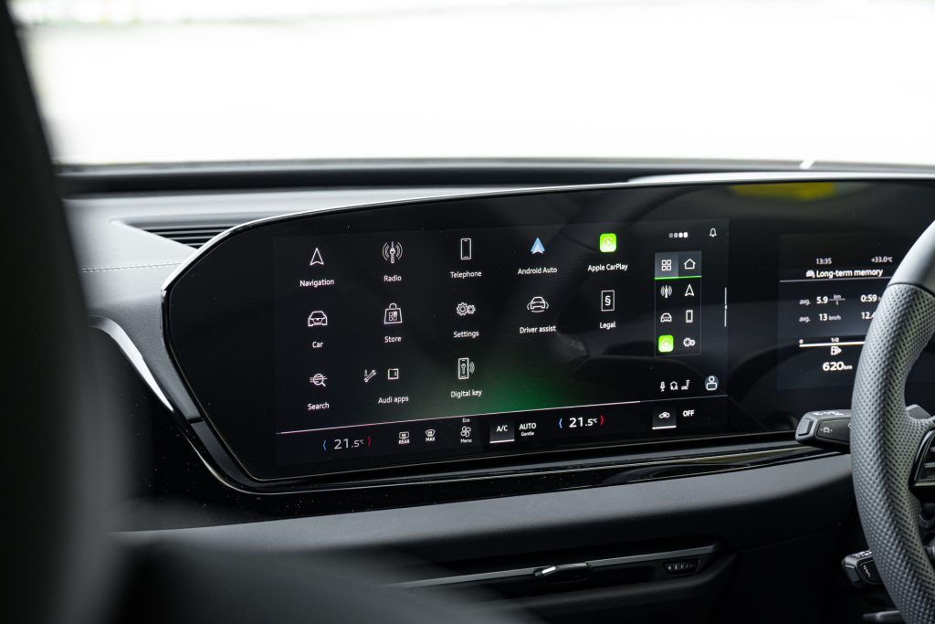 Fortunately, Audi has wisely dedicated some touchscreen real estate to climate control, which means you won’t be jabbing through menus just to cool your feet. Wireless Apple CarPlay and Android Auto come standard, as does wireless charging, complete with a cooling fan to keep your phone from boiling.
