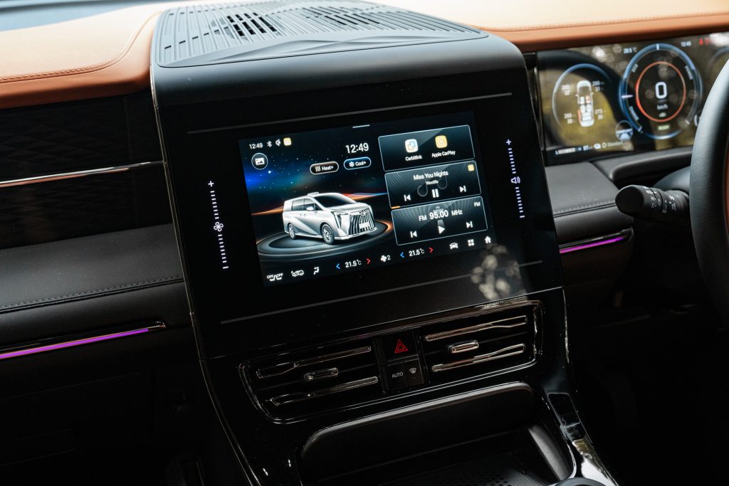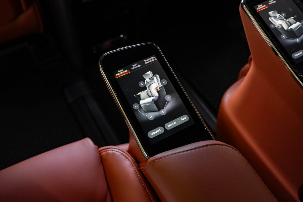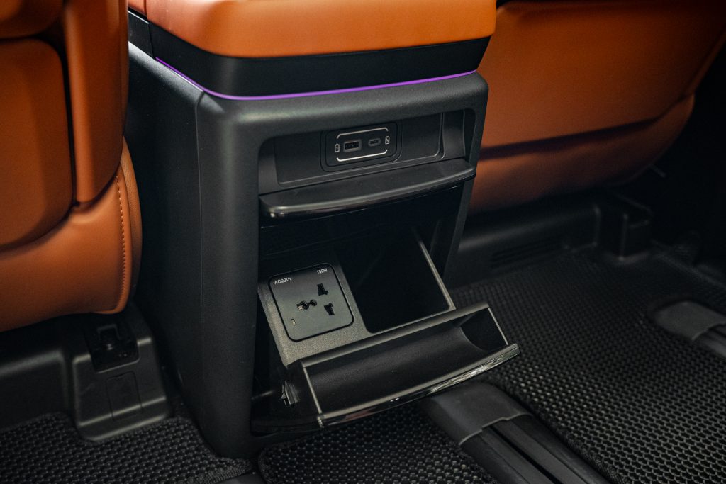 That said, the E9’s creature comforts don’t reach for gimmicks. There’s no dramatic ceiling-mounted TV or pop-out minibar, but you do get heated and cooled cupholders, a household-grade power socket, and two cleverly placed 1.5-metre air vents flanking the ceiling to quietly flood the cabin with chilled air.