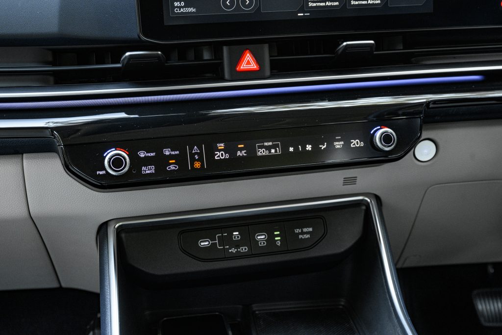 Kia’s streamlined controls keep things simple, with touch-sensitive buttons for volume, climate, and tuning controls, alongside faster USB-C charging for passengers.